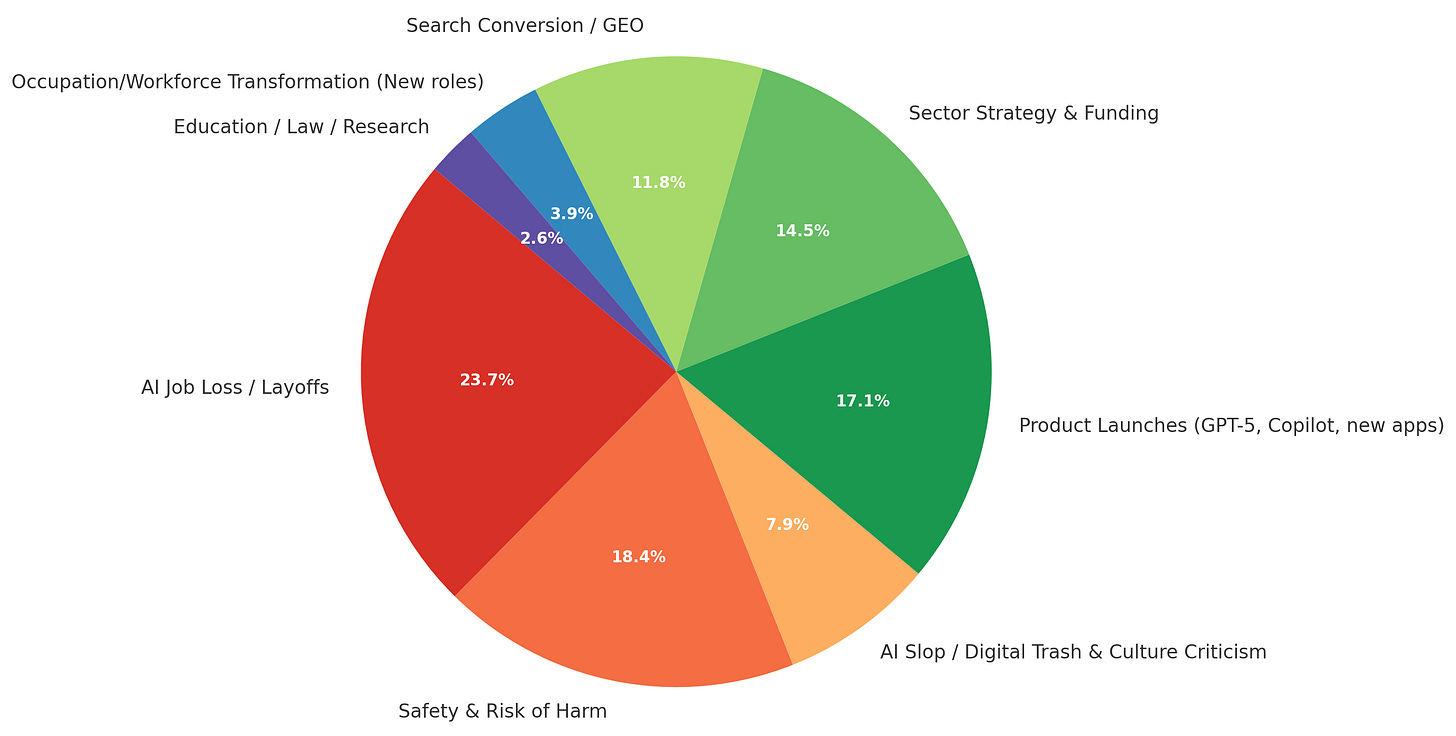 In the last six months, news headlines titled "AI" from high-traffic and serious publications such as Reuters, AP, TechCrunch, The Verge, WIRED were scanned. In total, 152 headlines were analyzed. The headlines were categorized based on the keywords (jobs, layoffs, safety, slop, funding, SEO, etc.) in their content. Each headline was assigned to a single category based only on the primary context (for example, if a news item evoked both "job losses" and "safety", the focal emphasis of the headline was taken into account). These categories were then subjected to frequency analysis and percentages were calculated.